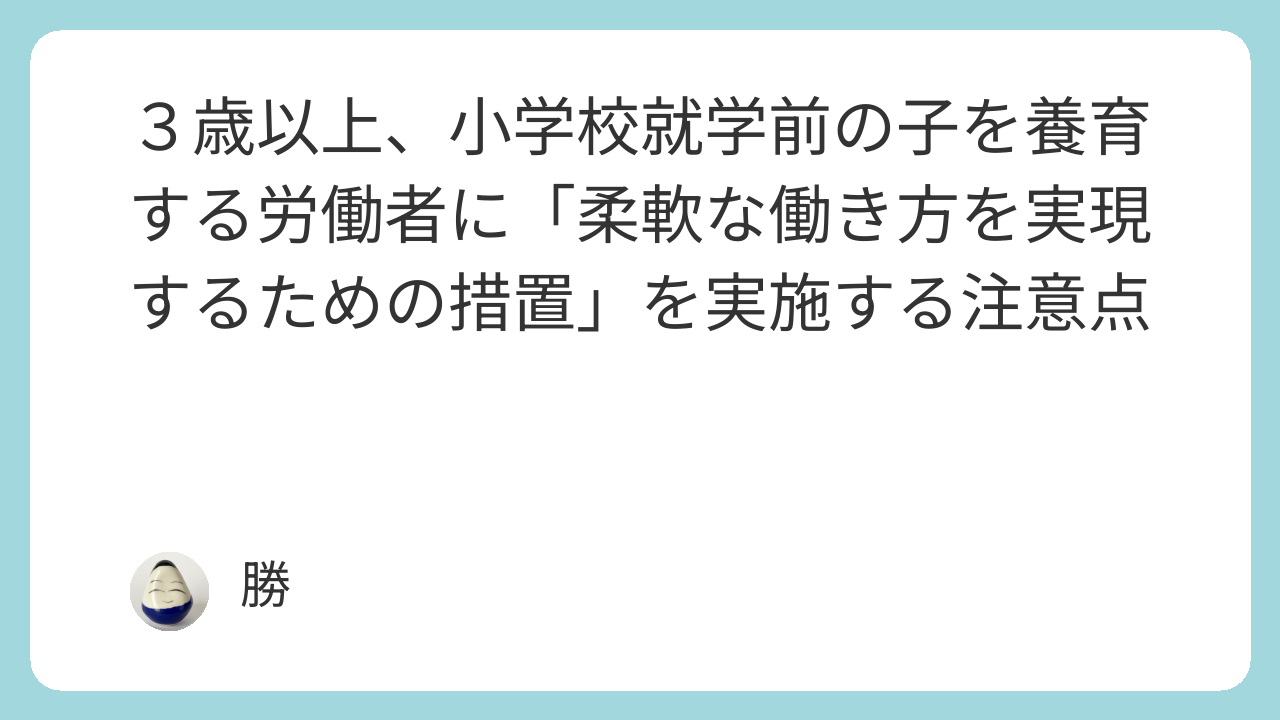 3歳以上、小学校就学前の子を養育する労働者に関する柔軟な働き方を実現するための措置を実施しなければなりません。(2025年10月改正施行)事業主が、「柔軟な働き方を実現するための措置」を選択・導入する際に注意すべき点は多岐にわたります。主な注意点を以下に整理します。
