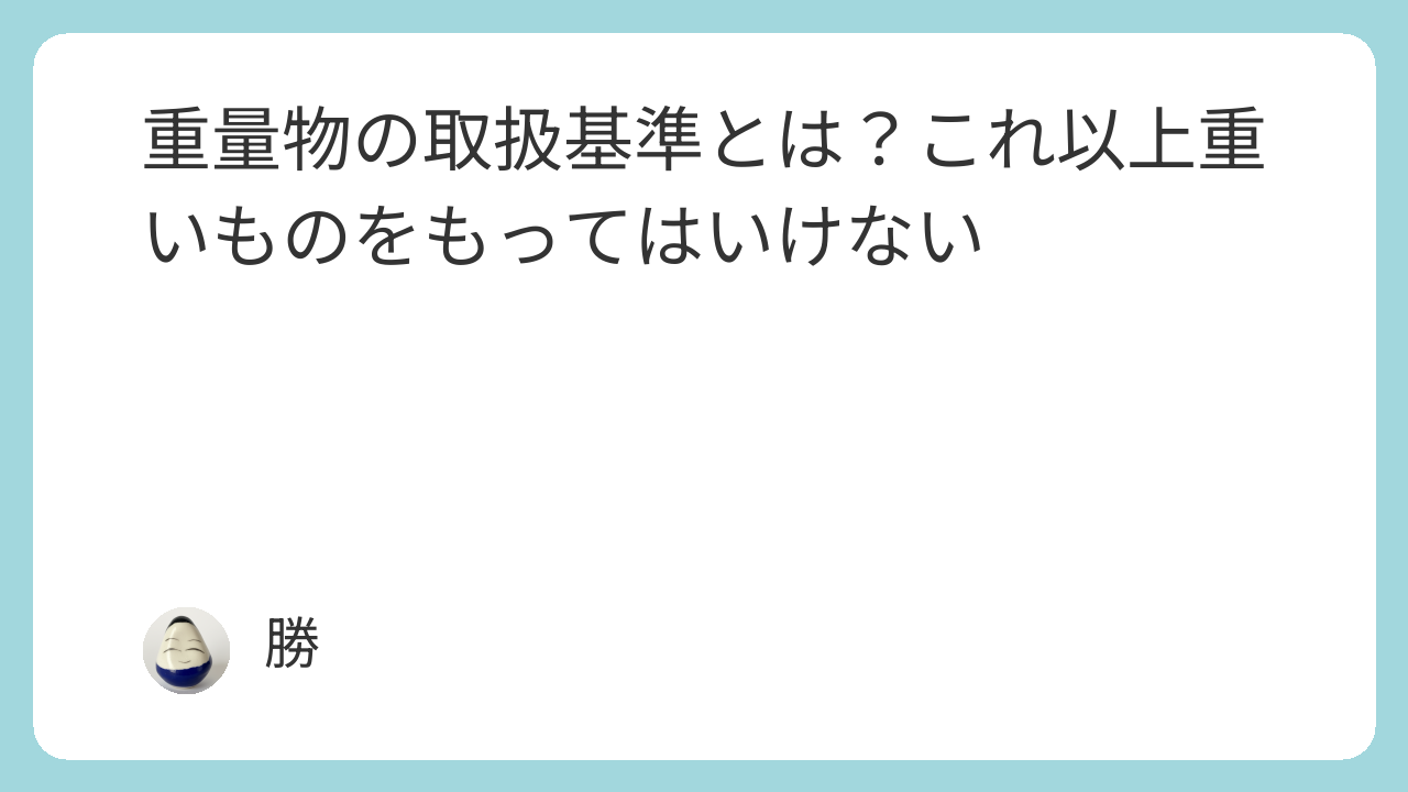 | 満18歳以上の男子労働者 | 体重のおおむね40%以下となるよう努める | 法令上の明確な上限はないが、腰痛予防の目安 |
