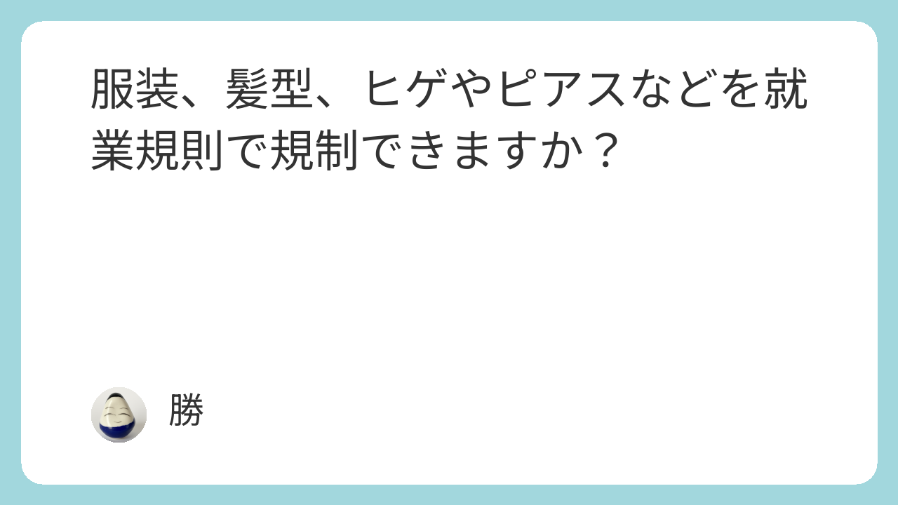 はい、就業規則で服装、髪型、ヒゲ、ピアス、タトゥー(入れ墨)などを規制することは可能です。ただし、その規制が合理的で、業務遂行上の必要性に基づいていることが重要であり、単なる個人の趣味や嗜好を不当に制限するものであってはなりません。